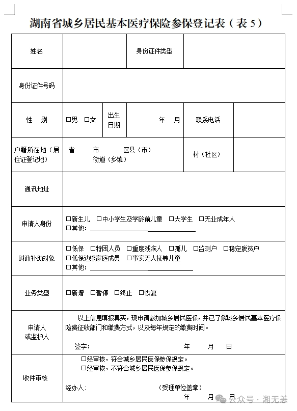 前期,“湘无恙”公众号依据《湖南省医疗保障经办政务服务事项办事指南(2025年版)》,已推送10项政务服务的详细信息。 今天推送第11项:“城乡居民减少登记(暂停参保)”的相关内容,与2023年版相比,该内容属于新增的4个事项之一。欢迎收藏和转发。 “城乡居民减少登记(暂停参保)”指南 01 事项名称 城乡居民减少登记(暂停参保)。 02 受理单位 乡镇人民政府(街道办事处)、村(社区)、大中专院校。 03 服务对象 除职工基本医疗保险应参保人员以及按国家规定享有其他保障的人员以外,其他所有城乡居民均属居民医保制度覆盖范围。具体包括农村居民、城镇非从业居民,在校学生及学龄前儿童,社区矫正对象,在我省居住且办理了居住证的未就业港澳台居民,在我省就读的港澳台大学生、外国国籍留学生,在我省永久居留的未就业的外国人,以及国家规定的其他人员。 04 办理渠道 (1)现场办理:各统筹区医保经办机构公布的经办服务大厅办理地址、各乡镇(街道)政务服务大厅、各村(社区)便民服务中心。 (2)线上办理:各统筹区医保经办机构向社会公布的网站、湖南省医疗保障网上服务大厅、湖南省政务服务平台、“湘医保”APP或微信公众号、“湘易办”APP等。 05 办理流程 (1)申请。申请人向乡镇人民政府(街道办事处)、村(社区)提交相关资料(有效身份证件和《湖南省城乡居民基本医疗保险参保登记表》),申请办理城乡居民减少登记(暂停参保)。 (2)受理。乡镇人民政府(街道办事处)、村(社区)工作人员受理申请人提交的申请材料,确认其是否属于受理范围、材料是否齐全。属于受理范围且材料齐全的当场受理,材料不全的一次性告知需补齐的材料并重新提交;不予受理的应告知理由。 (3)办结。 06 办理材料 (1)有效身份证件; (2)《湖南省城乡居民基本医疗保险参保登记表》(表格样式附后,点击左下角“阅读原文”可在文末下载电子版)。 备注:个人出现国家规定的停止享受医保待遇的情形后,待遇享受人员或者其亲属应当自相关情形发生之日起20个工作日内告知医保经办机构。 07 办理时限 即时办结。 08 查询方式 现场查询、线上查询(各统筹区医保经办机构公布的电话、门户网站、手机APP或微信公众号等)。 09 监督电话 各统筹区医保经办机构向社会公布的监督电话。 10 评价渠道 现场评价、线上评价、第三方评价等,并向社会公布。评价内容主要包括信息公开、办事效率、依法依规办理等。 湖南省城乡居民基本医疗保险 参保登记表