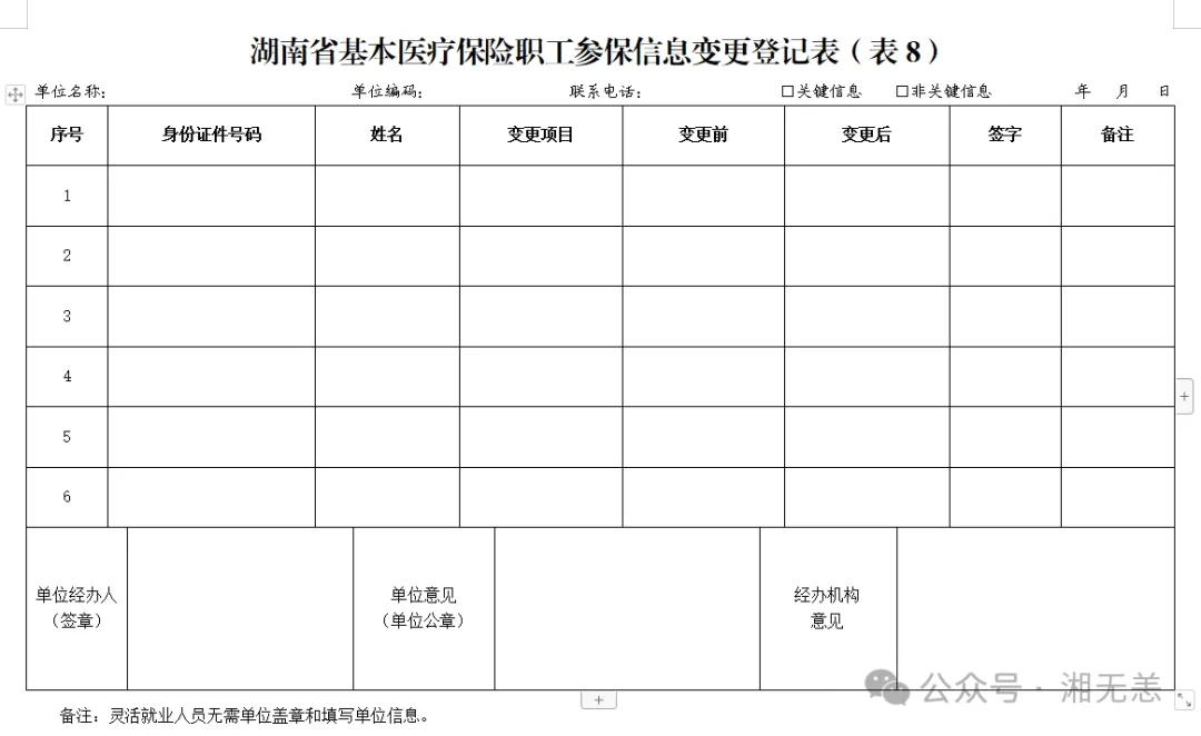“职工参保信息变更登记”指南 01 事项名称 职工参保信息变更登记。 02 受理单位 全省各级医疗保障经办机构(以下简称“医保经办机构”)。 03 服务对象 各类国家机关、企事业单位、社会团体、民办非企业单位和有雇工的个体工商户等用人单位职工及灵活就业人员。 04 办理渠道 (1)现场办理:各统筹区医保经办机构公布的经办服务大厅办理地址、各乡镇(街道)政务服务大厅、各村(社区)便民服务中心(灵活就业人员参保信息变更登记可在乡镇或街道政务服务大厅、村或社区便民服务中心办理,且仅限于非关键信息)。 (2)线上办理:各统筹区医保经办机构向社会公布的网站、湖南省医疗保障网上服务大厅、湖南省政务服务平台等。 05 办理流程 (1)申请。申请人按属地管理原则通过线上或现场向医保经办机构提出职工参保信息变更登记申请。 (2)受理。医保经办机构工作人员受理申请人提交的申请材料,确认其是否属于受理范围、材料是否齐全。属于受理范围且材料齐全的当场受理,材料不全的一次性告知需补齐的材料并重新提交;不予受理的应告知理由。 (3)审核。医保经办机构对提交的材料进行审核,审核通过的予以变更登记,审核不通过的将原因告知申请人。 (4)办结。 06 办理材料 (1)医保码或有效身份证件或社保卡; (2)《湖南省基本医疗保险职工参保信息变更登记表》(加盖单位公章;表格样式附后,点击左下角“阅读原文”可在文末下载电子版) 备注:变更姓名、性别、身份证号、参加工作时间、档案记载首次出生日期、人员身份、人员状态等关键信息的,应提供必要的佐证材料(复印件需单位核对原件并加盖单位公章)。 07 办理时限 即时办结。 08 查询方式 现场查询、线上查询(各统筹区医保经办机构公布的电话、门户网站、手机APP或微信公众号等)。 09 监督电话 各统筹区医保经办机构向社会公布的监督电话。 10 评价渠道 现场评价、线上评价、第三方评价等,并向社会公布。评价内容主要包括信息公开、办事效率、依法依规办理等。 湖南省基本医疗保险职工参保 信息变更登记表