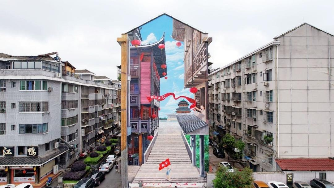在芷江和平大桥东侧,一幅融合侗族建筑与和平主题的巨型墙绘成为新晋网红打卡点。这幅融合侗族建筑与和平主题的艺术作品,通过虚实台阶将视线引向湖南抗日战争纪念馆,象征从现实回溯历史的精神之旅。画中挥旗青年与抛红绸的侗家女孩形成时空对话,生动诠释“铭记历史 珍爱和平”的深刻主题。这种艺术表达,既是对侗族文化的诗意呈现,更是对和平理念的深情诠释。
