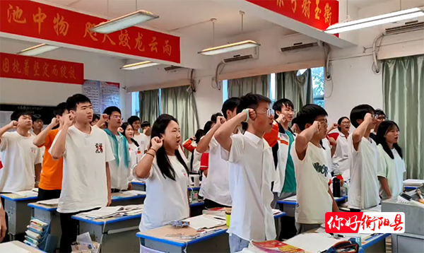 “我宣誓:......信守报考承诺,诚信参加考试,沉着细心考出佳绩!”5月29日,衡阳县四中学生握紧拳头,进行诚信高(学)考宣誓。