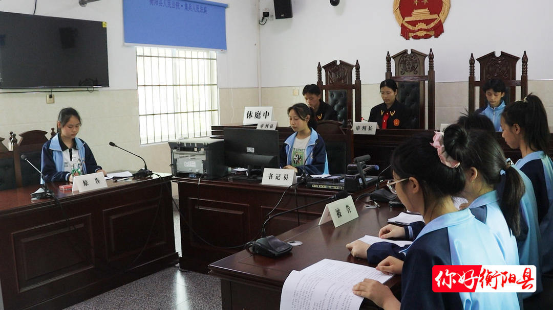 当天,在衡阳县人民法院集兵法庭,集兵中学的学生们现场参观了法庭,并邀请学生们体验模拟法庭,审判员、人民陪审员、书记员、原告、被告均由学生扮演,从“书记员”宣读法庭纪律、传“被告人”到庭、到“原告”宣读起诉书、“被告人”陈述,同学们根据自己所扮演的角色融入情景,全情投入角色。