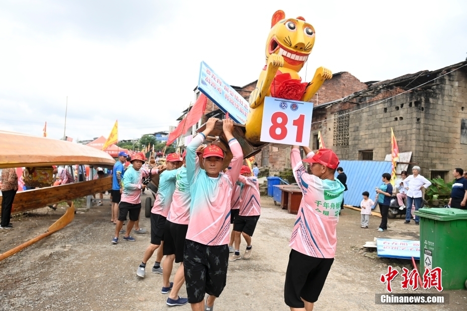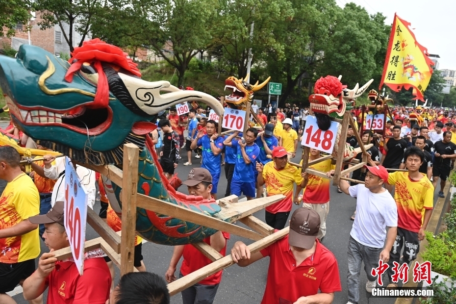 5月31日,“中国龙舟之乡”湖南永州市道县的民间运动员抬着雕刻精美的龙、虎、凤、麒麟四大类各式龙船头在街头上演百龙出征巡游,迎接即将到来的端午佳节。