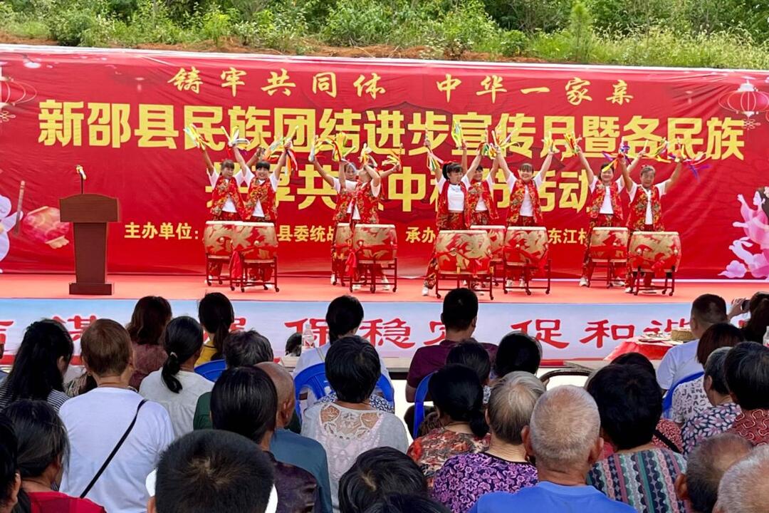 观汇演,共建民族团结舞台。9月14上午,主体活动“铸牢共同体,中华一家亲”各民族共享共庆中秋节汇演于东江村文化广场举行,邵阳市委办、市民宗局、县统战部领导及各族群众共500余人齐聚一堂,共庆盛世佳节,共叙深厚情谊。各民族群众接续登台,精彩纷呈,歌曲《美丽中国》、《最亲的人》,舞蹈《爱我中华》、《威风锣鼓》、《鸿雁》等节目以深情的演绎表达了各族群众对祖国的热爱之情。特邀的新疆维吾尔族表演者拨动都塔尔、敲响手鼓,以民族之声吟唱团结深情。东江村回族姑娘即兴伴舞将活动气氛推向高潮,掌声、喝彩声不绝于耳。中秋佳节之际,一场精彩热闹、趣味十足的展演活动让现场观众感受到不同民族文化的独特魅力和中华民族大家庭的温暖。