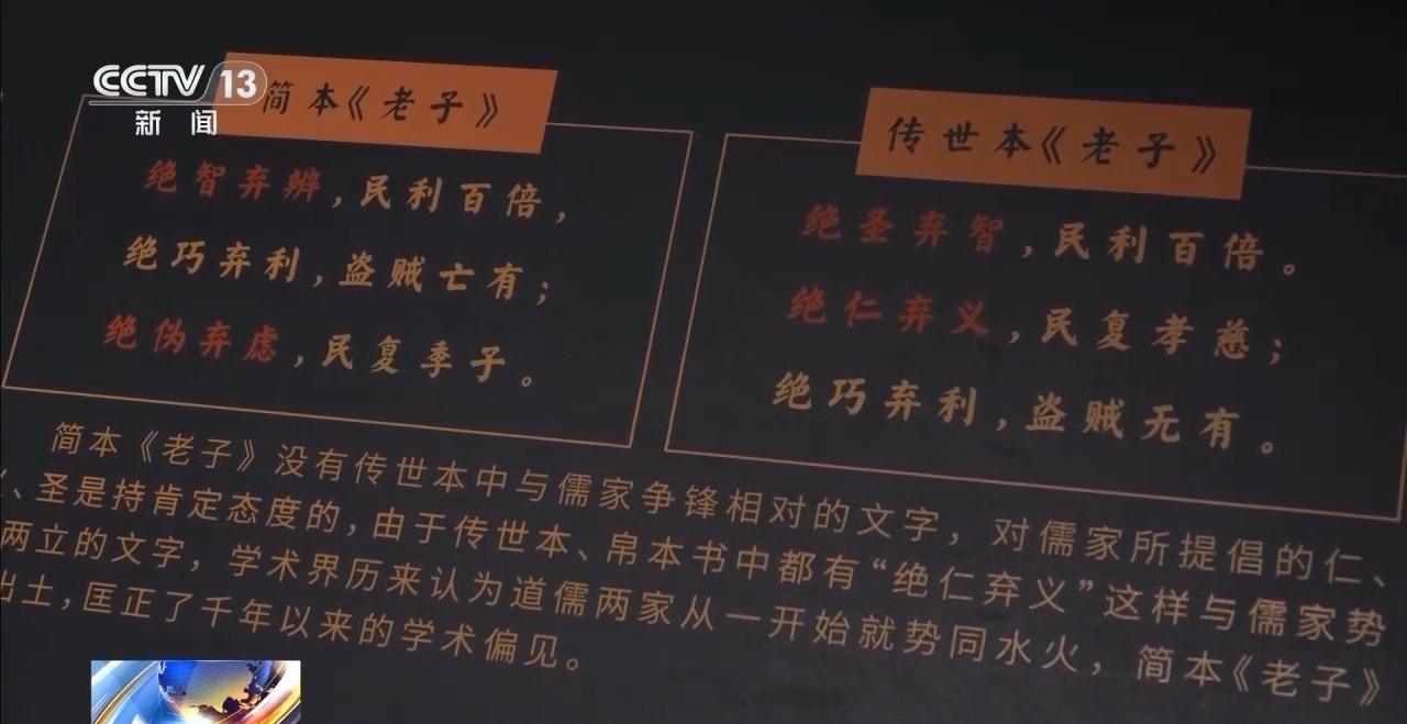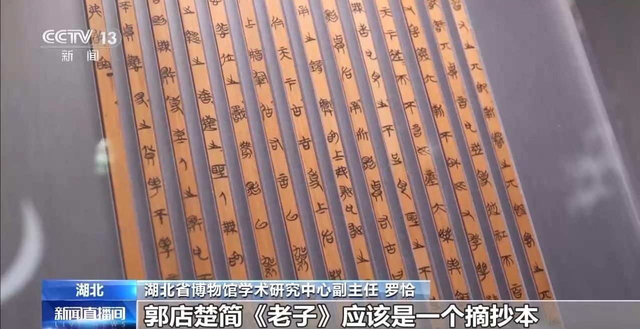 湖北省博物馆学术研究中心副主任 罗恰:郭店楚简《老子》应该是一个摘抄本,它不是全本,它篇章的分章、次序跟我们现在所流行的传世本《老子》有不同。我们现在的传世本《老子》它是分《道经》和《德经》的,郭店楚简(《老子》)它是不分的,它的面貌比较原始、比较古老。