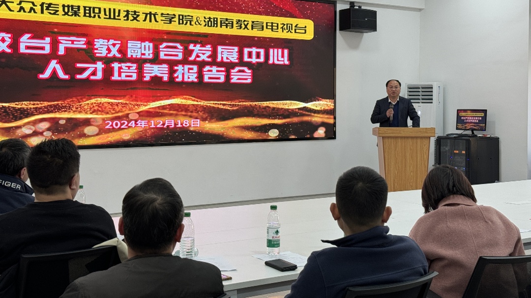 2024年12月8日,湖南大众传媒职业技术学院举行首场校台产教融合人才培养报告会,近百名师生齐聚在由学院和湖南教育电视台共建的校台产教融合发展中心,听取校台协同育人的阶段性成果汇报,共同展望携手推进产学研深度融合的新篇章。