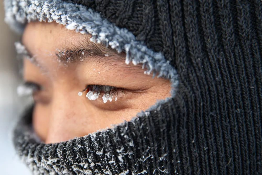 1月31日,在大兴安岭深处蒙克山脚下的黑龙江省塔河县盘古镇,中国铁路哈尔滨局集团有限公司加格达奇工务段盘古线路车间的工人鞠文浩的眼睫毛结上了冰霜