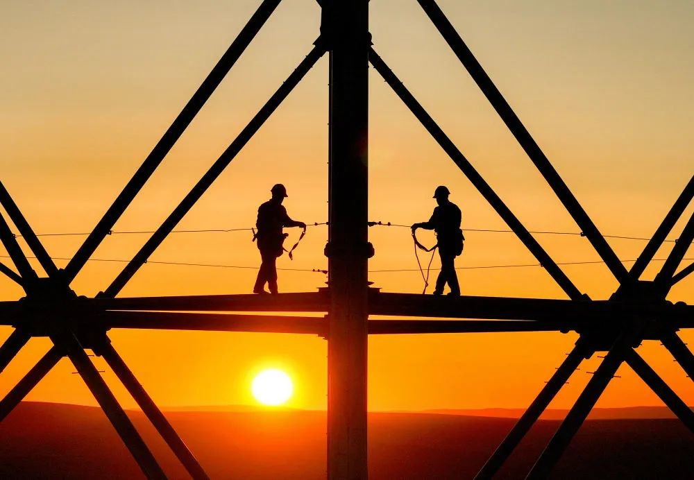 4月17日,工人在张北—胜利1000千伏特高压输电交流项目工程内蒙古段进行组塔作业
