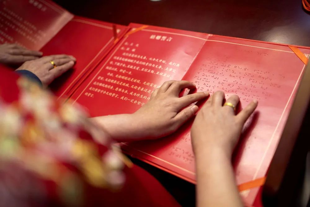 3月12日,在北京市西城区婚姻登记服务中心,患有先天性视力障碍的一对新人提前熟悉无障碍版结婚誓言准备进行结婚宣誓