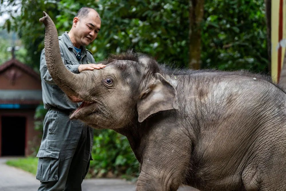 12月8日,在云南省西双版纳亚洲象救护与繁育中心,“象爸爸”陈继铭和小象玩耍