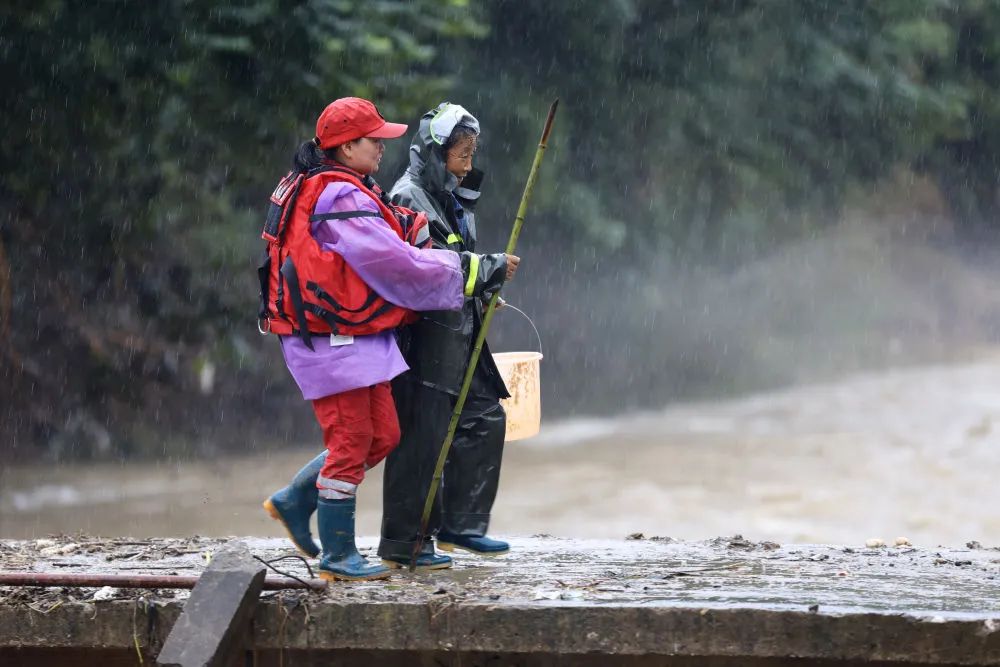 6月26日,山越救援队队员程红梅(左)在安徽省黄山市歙县绍濂乡和平村帮助村民过桥