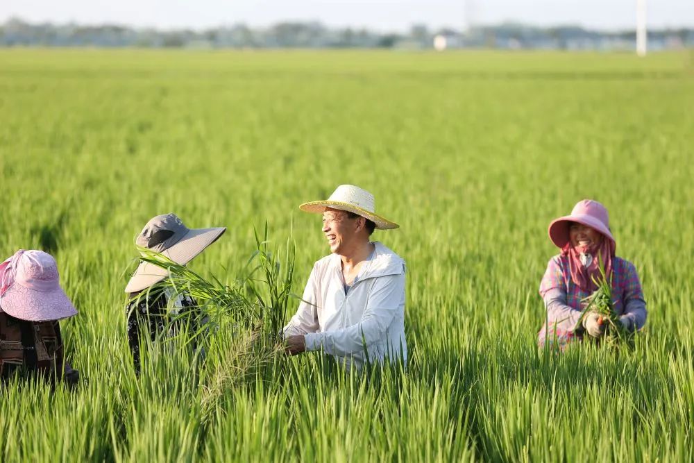 8月31日,在江苏省淮安市洪泽区岔河镇,农民企业家赵建国(右二)与村民在水稻田除草