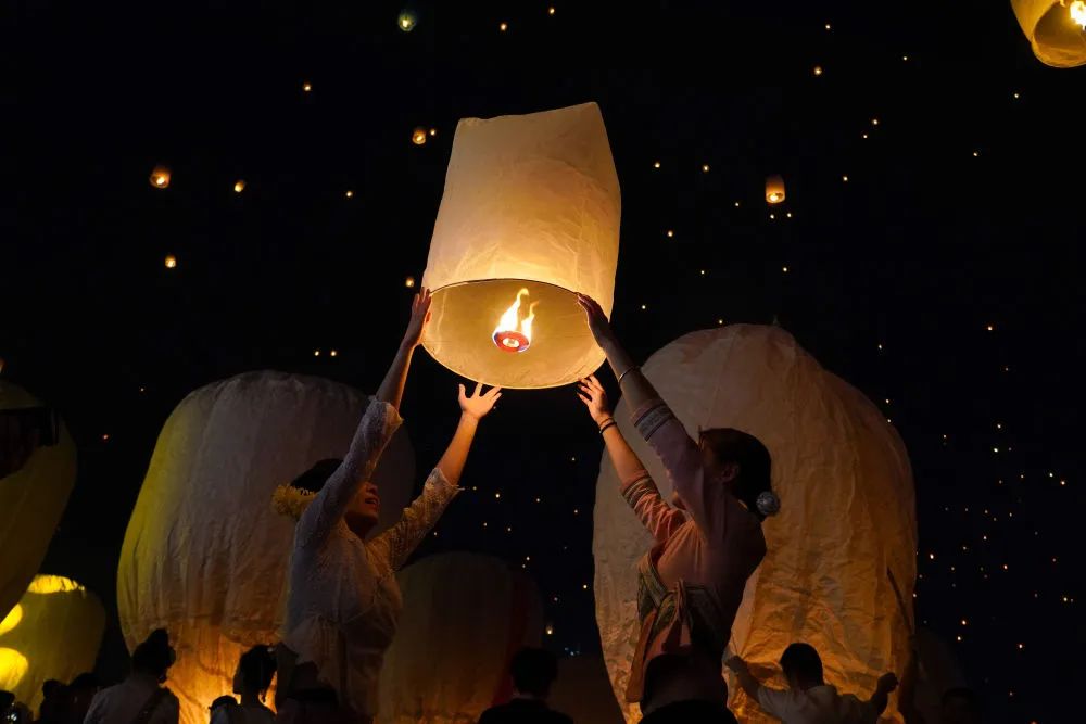 4月13日晚,人们在云南省景洪市澜沧江边放飞孔明灯,庆祝泼水节