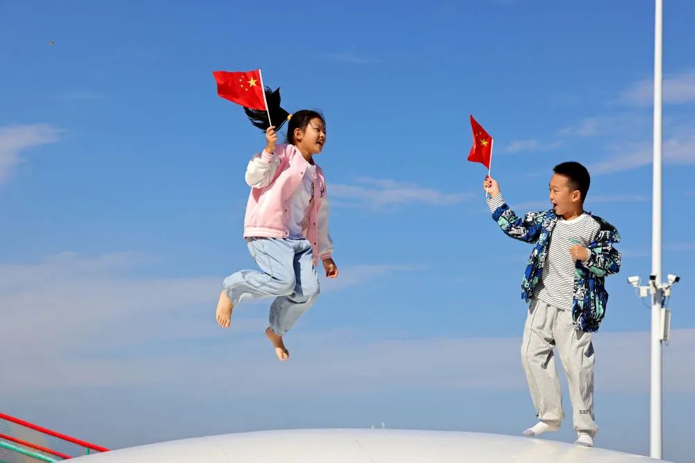 10月1日,在山东省枣庄市东湖公园,小朋友在“弹力球”上跳跃