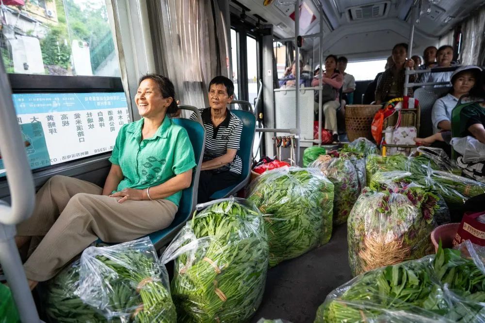 5月23日,在湖南湘西州吉首市马颈坳镇新湾村,菜农搭乘被称为“菜农公交专线”的吉首15路公交车