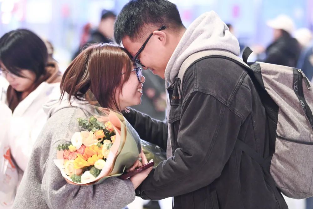 2月5日,在广西柳州站出站口,一名接站者与刚出站的女朋友碰头互动