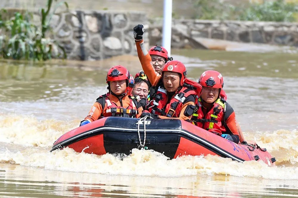 7月29日,在吉林省临江市,临江市消防救援大队世纪大街站副站长白云天(右二)在转运受困群众时,用手势指挥队员操控船只
