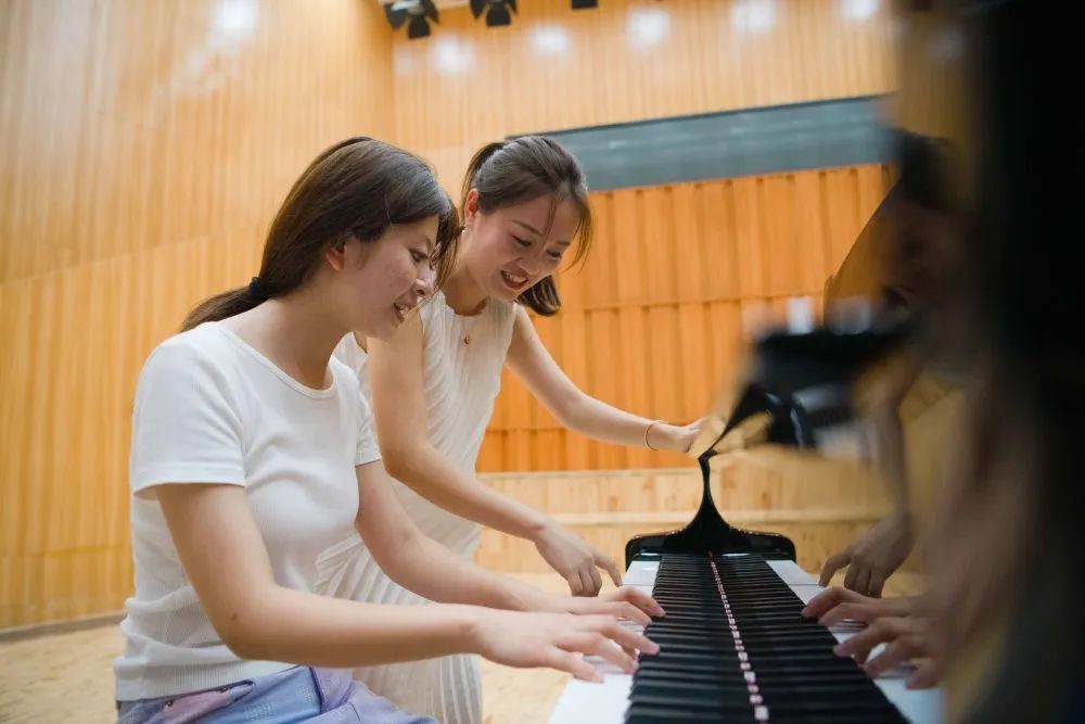 9月7日,在安徽艺术学院音乐学院,患有先天性眼疾的新生郁晓楠(前)在老师王昕的指导下弹奏钢琴