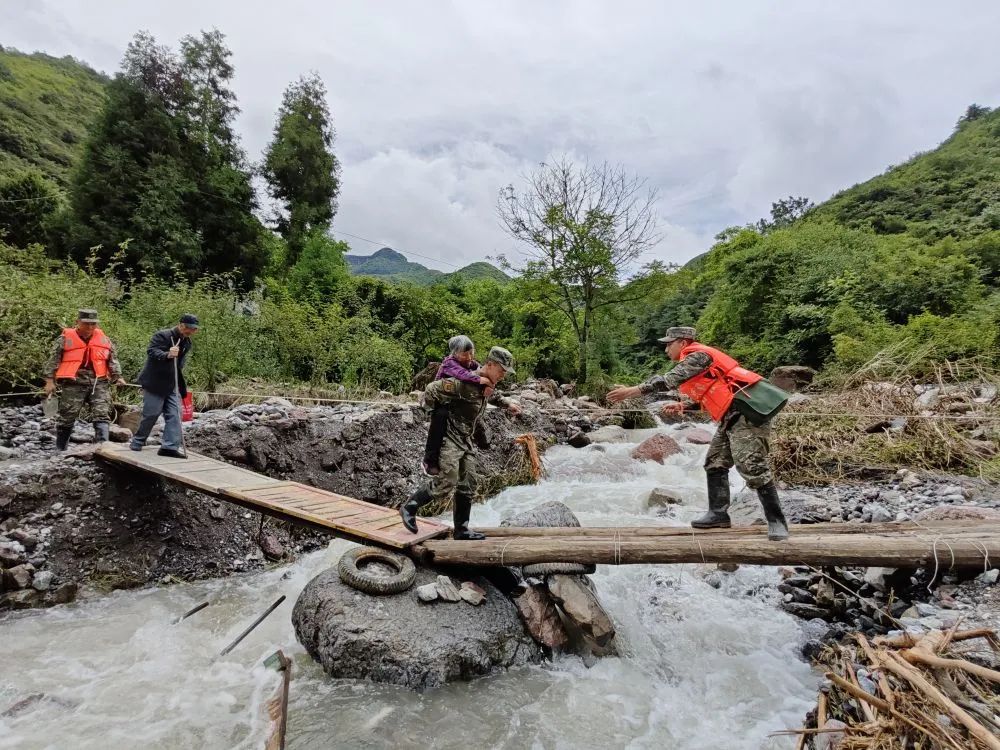 7月21日,在四川省雅安市汉源县马烈乡新华村,武警四川总队雅安支队官兵搭建简易桥梁转移群众。20日,新华村因暴雨突发山洪灾害