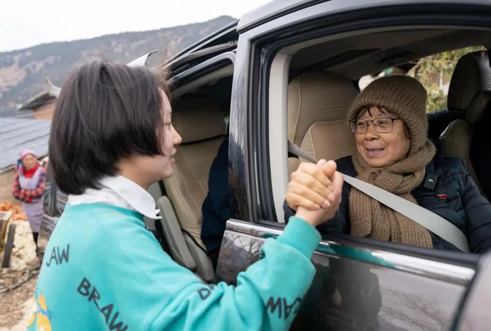2月6日,在云南省丽江市宁蒗彝族自治县一名学生(左)家中家访结束后,张桂梅在临别之际鼓励学生好好学习