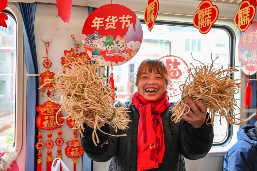 2月5日,在遵义开往重庆西的5630次列车上,旅客在车上展示选购的农产品