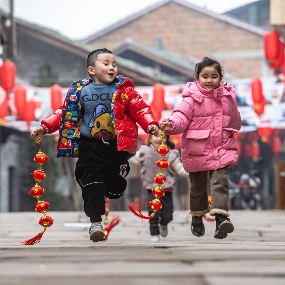 1月30日,在重庆市大足区,小朋友手拿小灯笼奔跑在雍溪古镇老街上