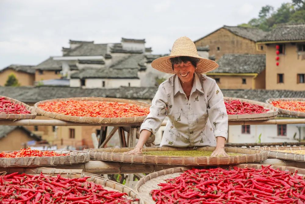 9月22日,在安徽省黄山市歙县阳产村,村民在土楼前晾晒农作物