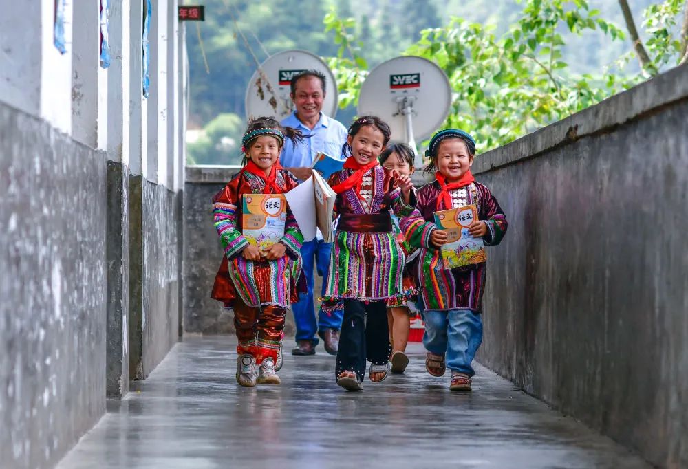 9月6日,在贵州省黔东南苗族侗族自治州从江县西山镇的中寨教学点,教师孟荣达(后)与学生们在下课后走出教室