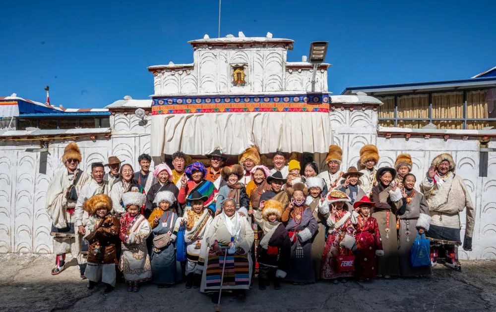 2月10日,在西藏拉萨市当雄县公塘乡甲根村,斯曲旺姆(前中)和家人拍摄全家福