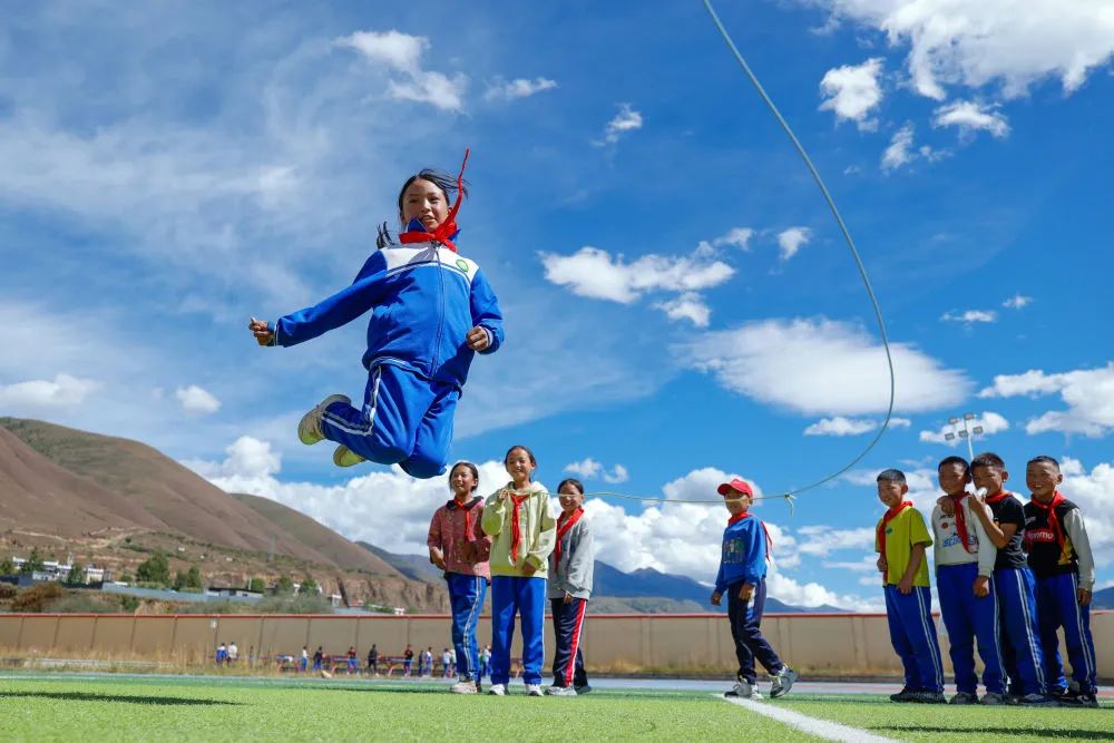 9月27日,在四川省甘孜藏族自治州,道孚县城关第一完全小学的学生在体育课上跳绳