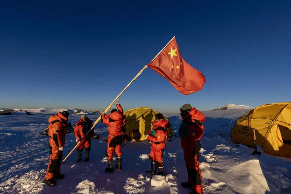 10月1日清晨,第二次青藏科考队普若岗日冰原冰芯钻取与冰面过程科考小组队员在营地安插国旗