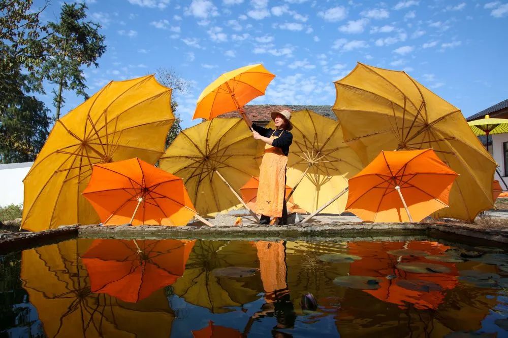 11月13日,在安徽省宣城市泾县昌桥乡孤峰村,国民油布伞厂的工人在晾晒油布伞