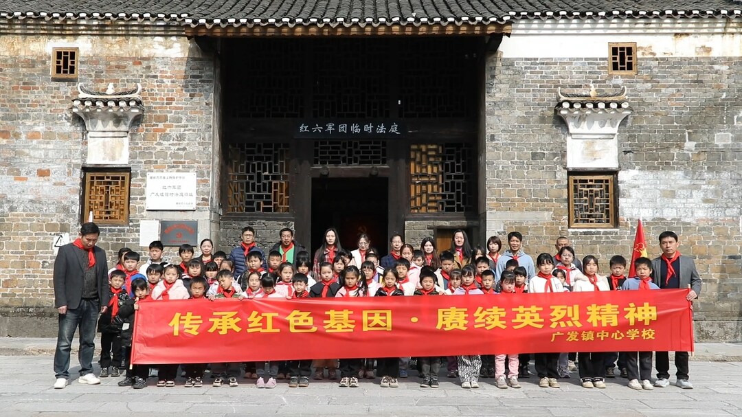 在红六军团广发墟临时法庭旧址内,广发镇新时代文明实践所志愿者为广发镇中心学校50余名学生带来一堂生动的红色故事课。通过情景讲述,学生们深刻感知红军长征的艰辛与伟大,感悟“长征英烈雄风永存”的精神内涵。
