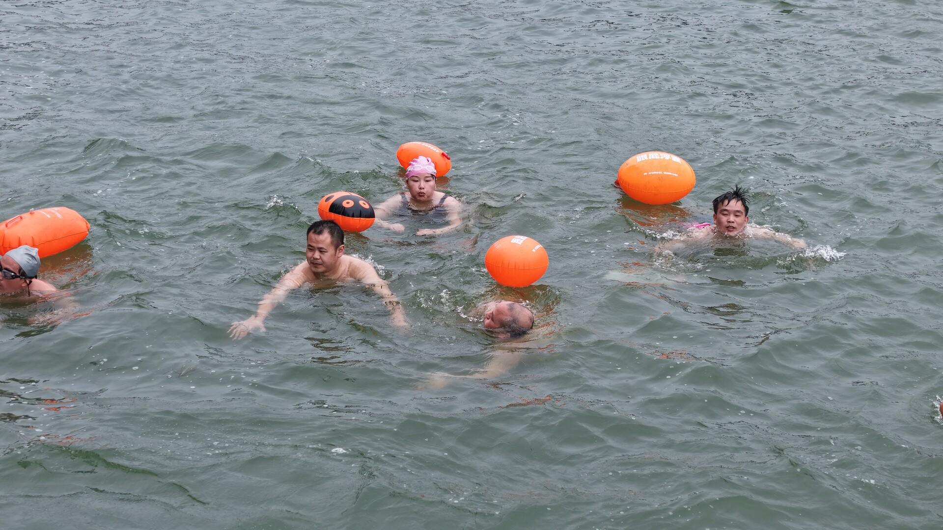 随着发令枪响,泳者们如“浪里白条”跃入清澈江水,他们以自由泳、蛙泳等不同泳姿奋力前行,形成一道流动的风景线。过程中,队员们相互鼓励、携手共进,展现出团结协作的体育精神。当部分成员体力不支时,身旁队友立即调整节奏陪伴游进,或分享呼吸技巧帮助恢复体力,最终全体人员历时一个多小时顺利抵达对岸。