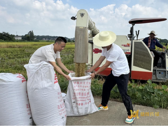 测产现场,农技人员和“三农”工作队队员严格按照测产要求,手持量规精准划定取样面积,随后进行农机收割、装袋称重,并详细记载数据,整个过程严谨细致、有条不紊。经过一番紧张忙碌的测算,好消息传来:“‘三农’工作队负责的三个田块样本结果分别是1158.6斤/亩、1194.4斤/亩、1115斤/亩,平均亩产量达1156斤,达到预期产量目标,喜获丰收!”