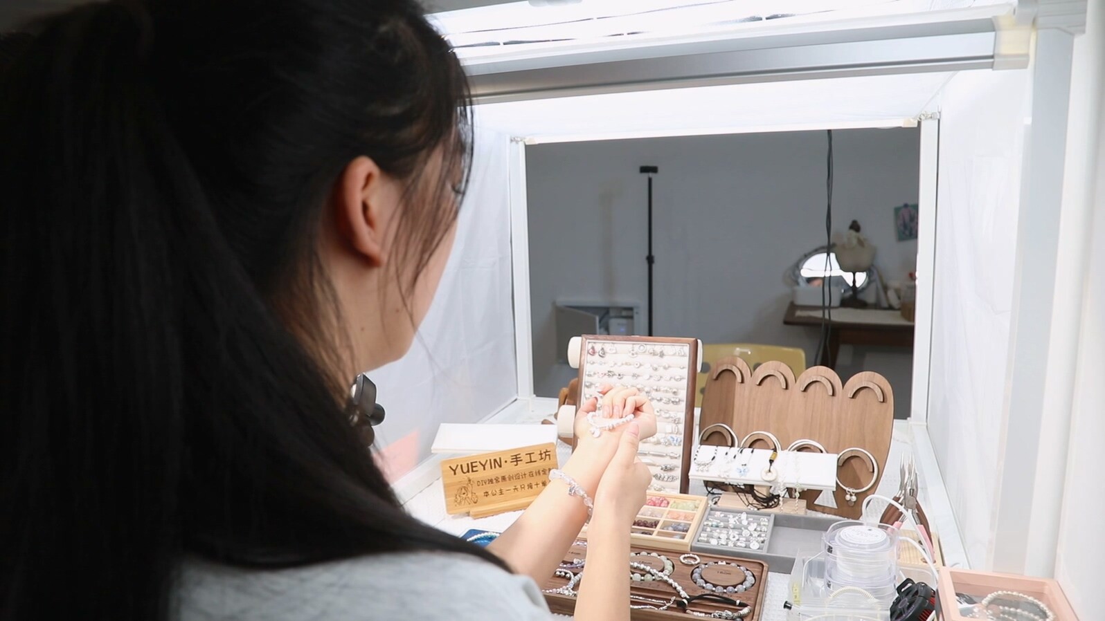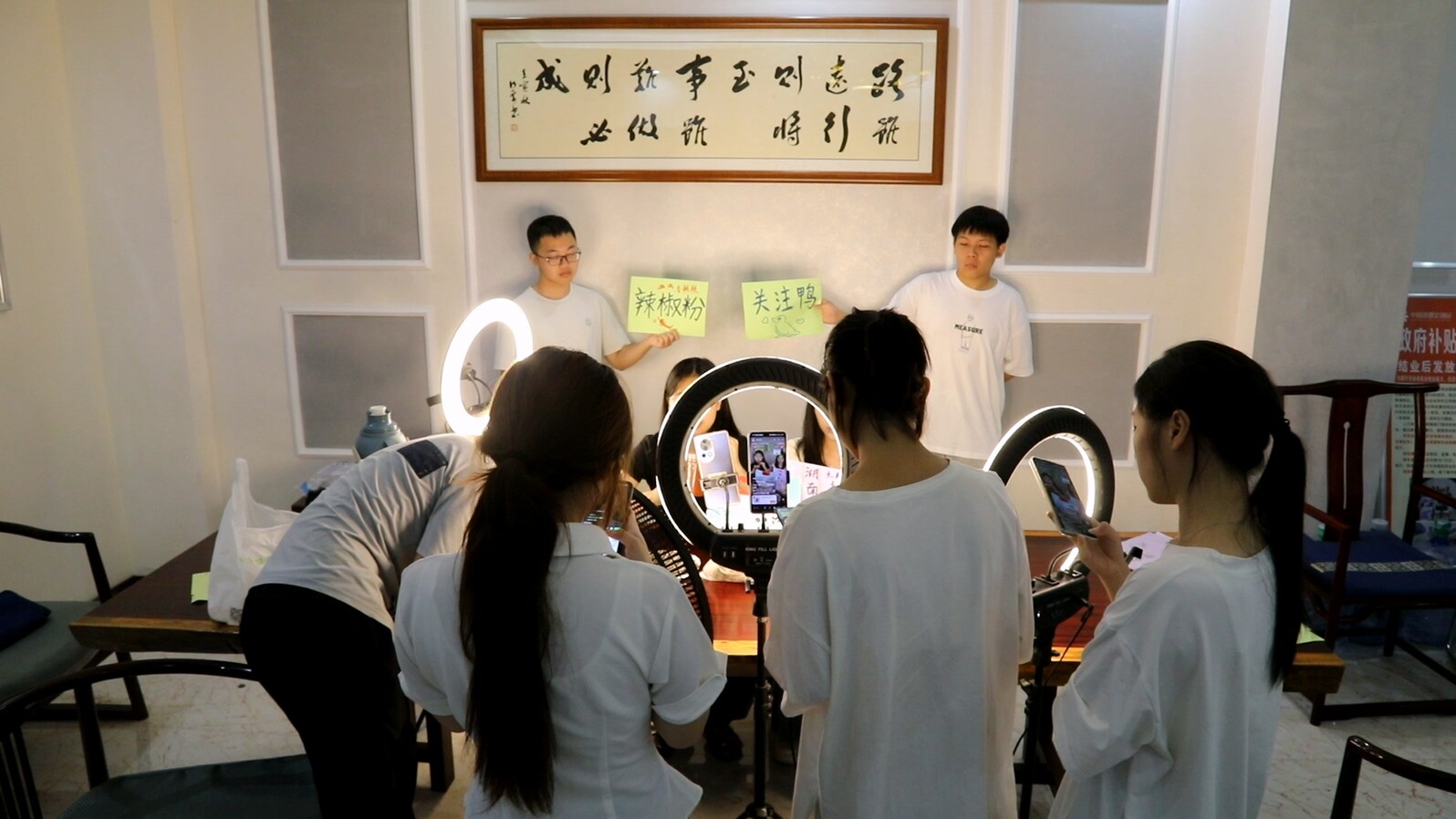 镜头前,创业大学生崔雪飘正热情洋溢地进行银饰品直播带货:“今天这一款给大家推荐的是来自我们‘中国银都’的银饰品,全部由我们匠心制作、纯手工雕刻,真的是非常哇撒的一款,大家都看一下吧......”
