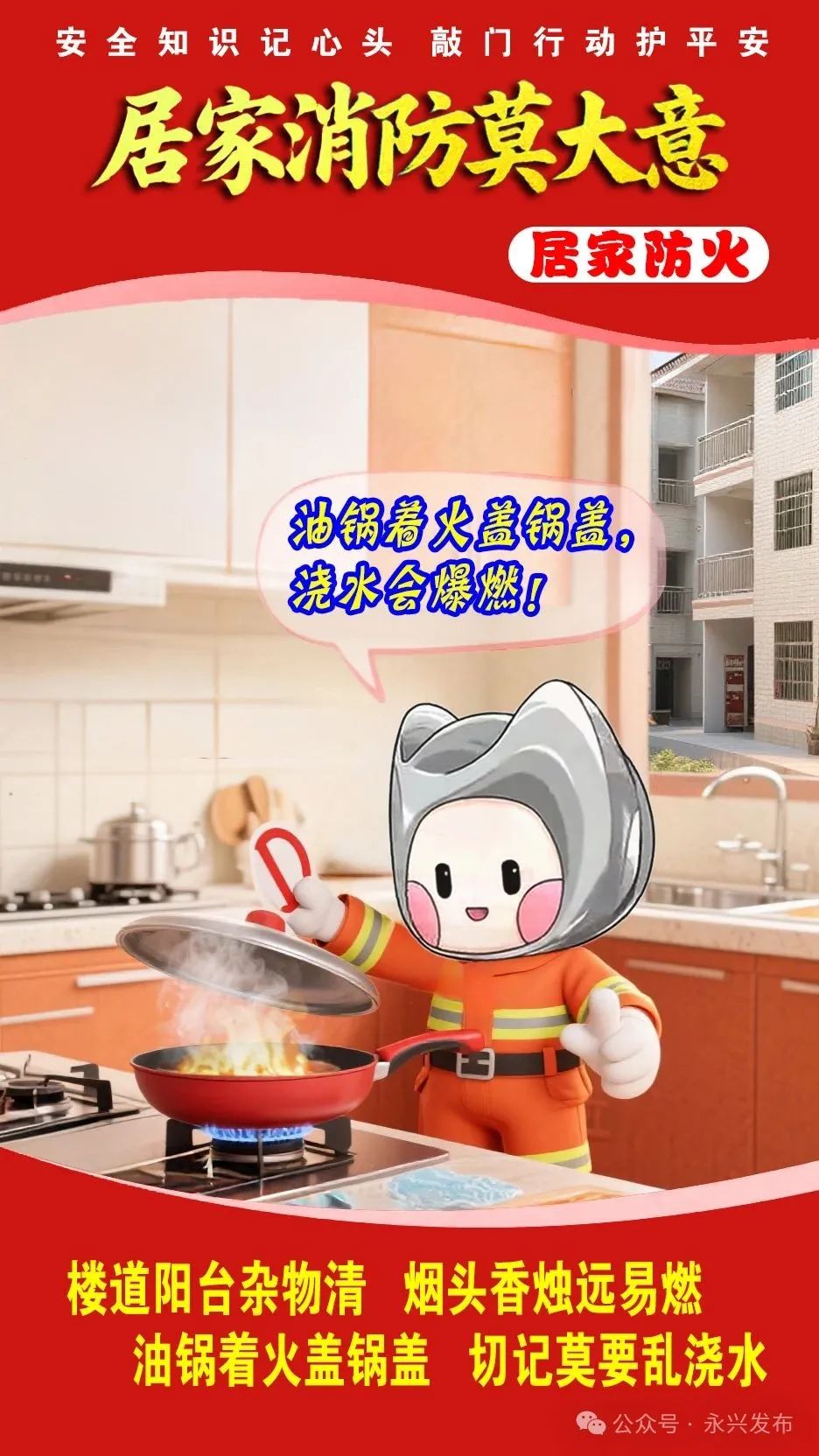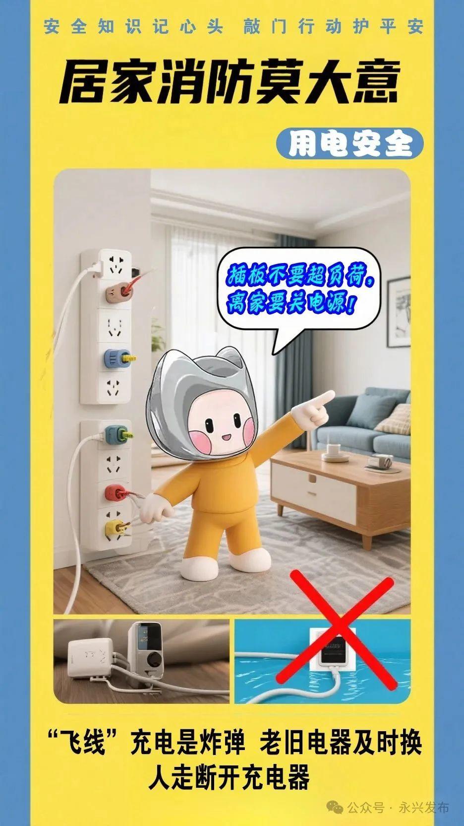 从居家用火用电用气注意事项到行业作业规范,从出行交通规则到“九小场所”隐患深查,从孩童风险防范到遇险科学自救!永兴县“敲门行动”聚焦六大安全维度推出系列安全宣传海报,以“油锅起火盖锅盖”、“湿巾捂鼻弯腰走”等通俗口诀解释复杂风险,让“河塘水库危险多”、“飞线充电是炸弹”等警示入脑入心。我们致力于筑牢从个人到场所的全链条防护网,让安全知识真正融入日常,触手可及。