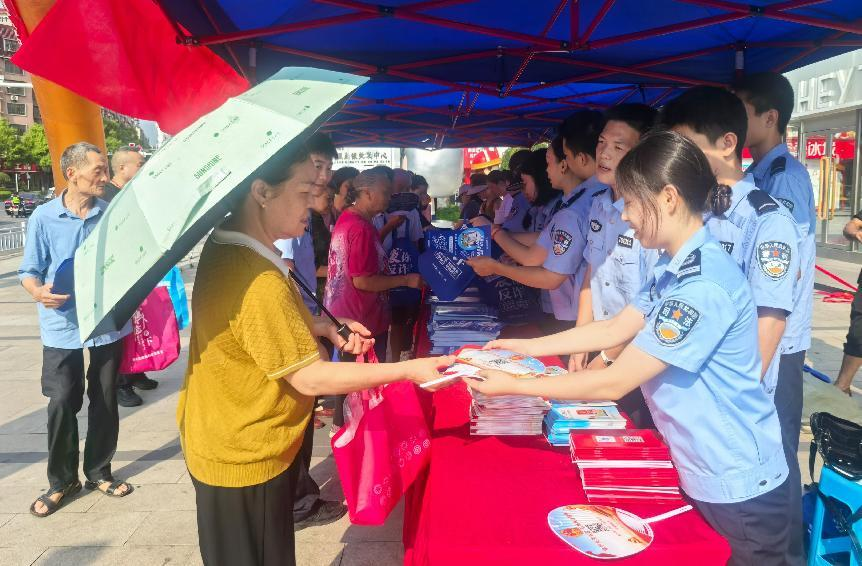 活动现场人头攒动,气氛热烈而有序,前来咨询和领取资料的群众络绎不绝,形成了一道亮丽的“反诈风景线”。工作人员热情地为来往群众发放反诈宣传手册、普法折页以及手机支架、扇子等实用法治文创产品,让反诈知识触手可及。