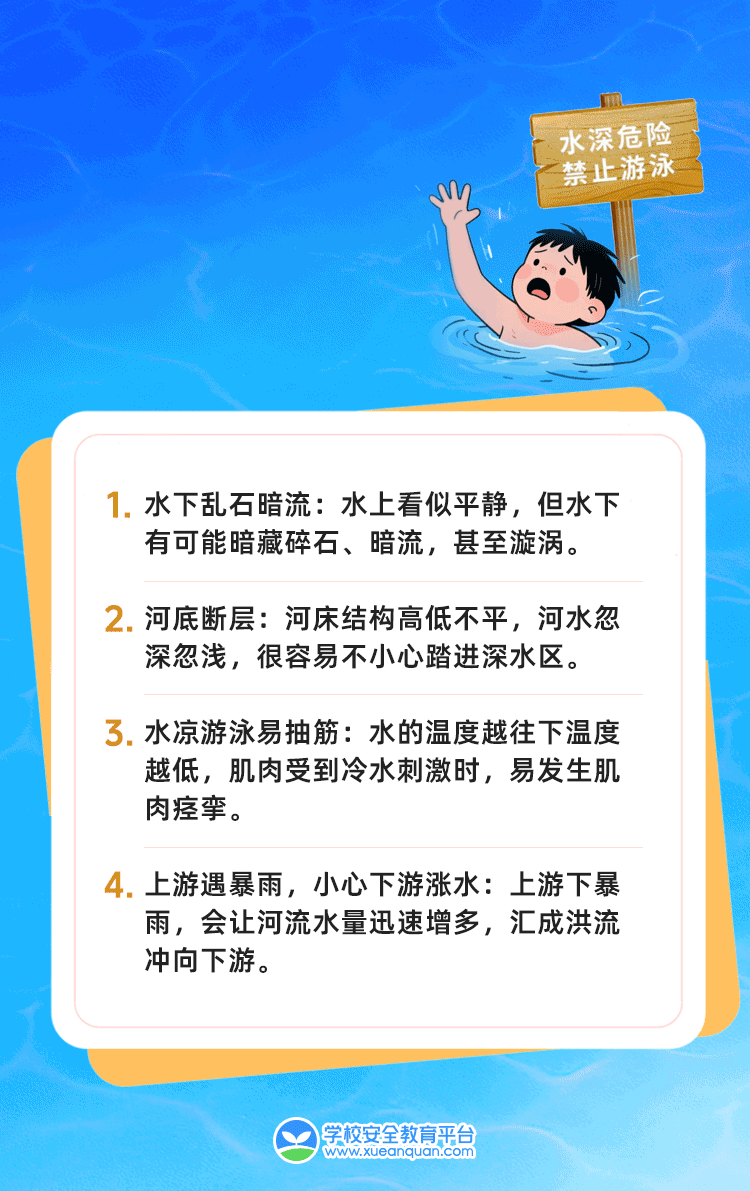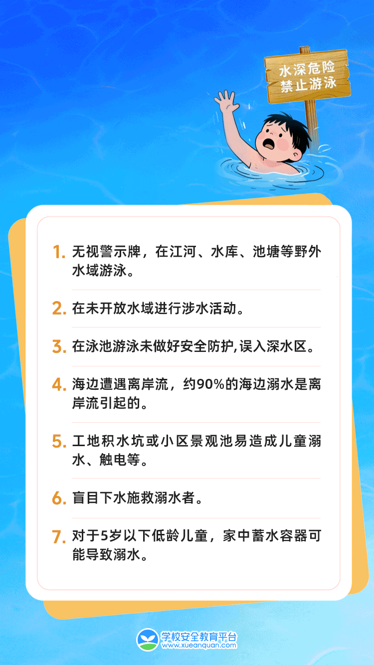 暑期虽已接近尾声 但溺水事故仍处易发期和高发期 恳请各位家长务必绷紧安全弦 切实履行监护责任 绝不能让孩子独自或结伴 前往危险水域嬉戏! 江河、水库、水塘、溪流、水潭等 看似平静的水域 潜藏的危险往往远超想象 加之当前我国已全面进入汛期 突发涨水、极端天气等风险交织叠加 水域安全隐患进一步升级