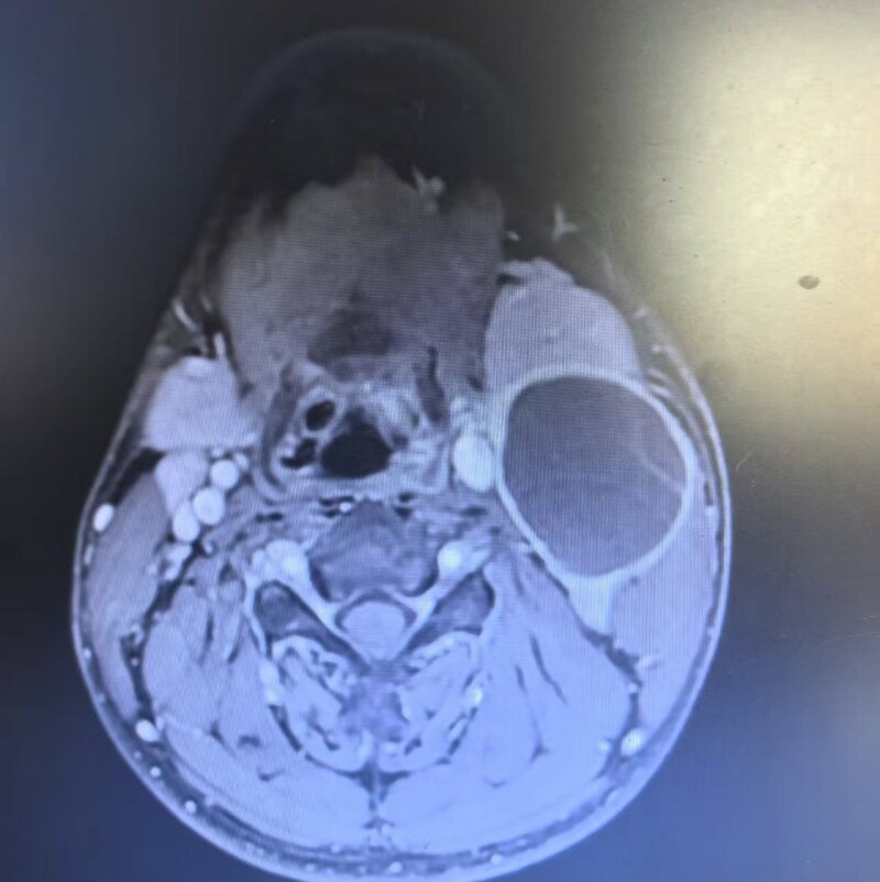 患者曹某,17岁,因发现颈部左侧无痛性肿块10余天,且近期感觉吞咽不适与声音嘶哑前来就诊。经检查,发现其左侧颈动脉有一大小约5.5×3.8cm的囊性占位性病变。影像学显示,肿瘤位置极深,与颈内动脉、颈外动脉关系密切,与迷走神经、舌下神经等重要结构粘连严重,手术难度和风险极大。