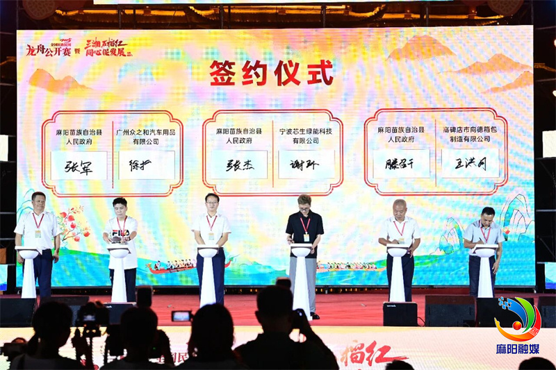 活动举行了2025全国民族民间龙舟公开赛暨“三湘石榴红·同心促发展”龙腾麻阳行启动仪式和“三湘石榴红·同心促发展”龙腾麻阳行项目签约仪式,麻阳与6家企业签约,签约金额达22.5亿元。同时,还举行了“幸福麻阳”首届龙舟宴村厨争霸赛颁奖仪式,并开展非物质文化遗产展演,以锦江母亲河为情感血脉,通过《龙腾锦江》开场表演、麻阳船工号子《长河号子》、苗族盛装秀《七彩苗韵》、原创花灯戏等精彩节目,展现了麻阳深厚的文化底蕴和非遗魅力。