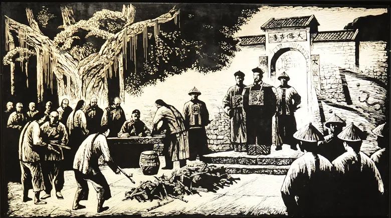 林则徐在大佛寺收缴烟土烟枪。图源:中国禁毒