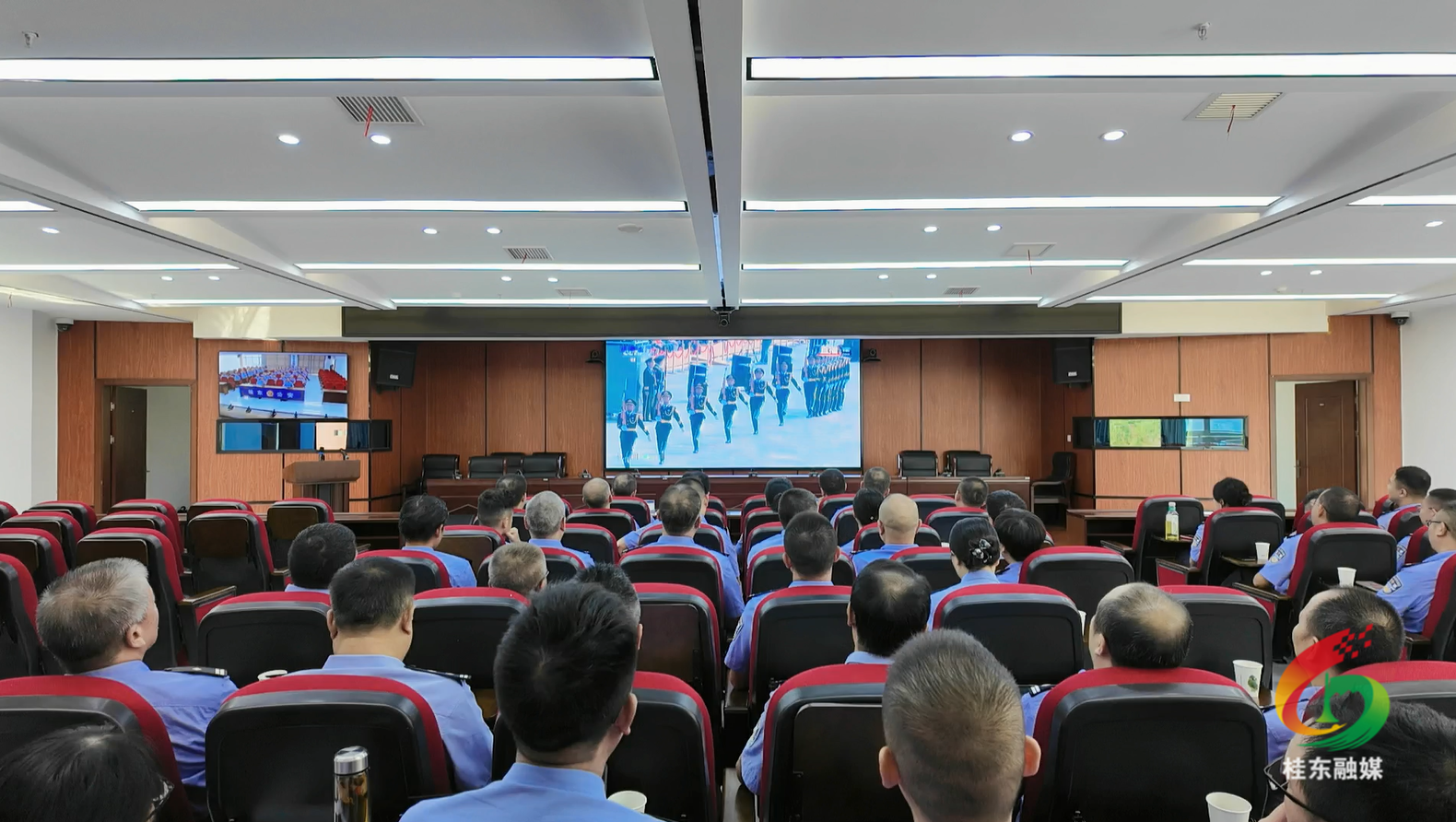 在县公安局会议室,全体人员警容严整、全神贯注观看,认真感受国防和军队现代化建设辉煌成就。