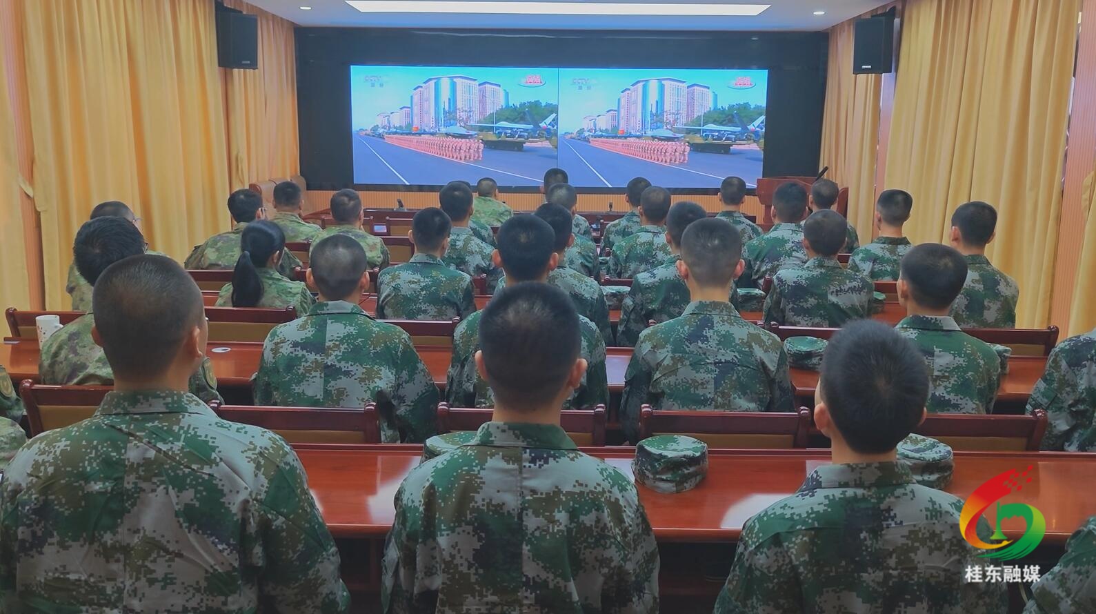 县人武部会议室内,气氛庄重热烈。数十名预定新兵和人武部官兵整齐端坐,集中收看大会直播。屏幕中,三军将士步伐铿锵、装备方队铁流滚滚、空中梯队呼啸苍穹。这些即将步入军营的新兵们神情专注,眼中闪烁着敬佩与向往的光芒。