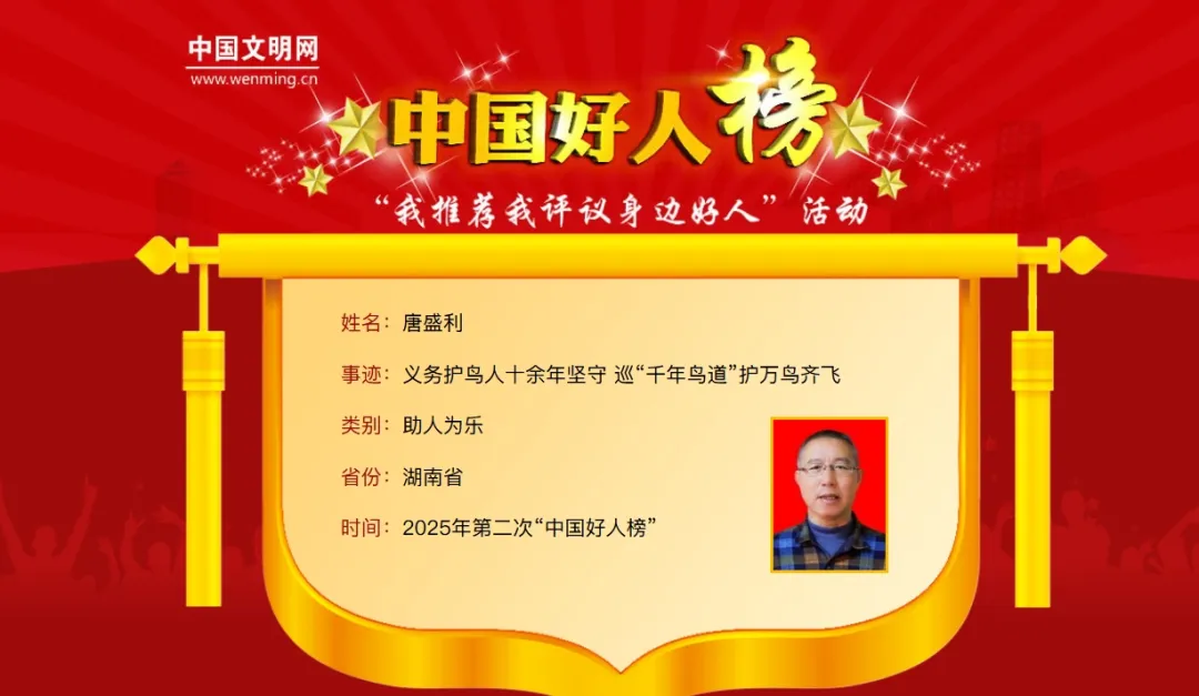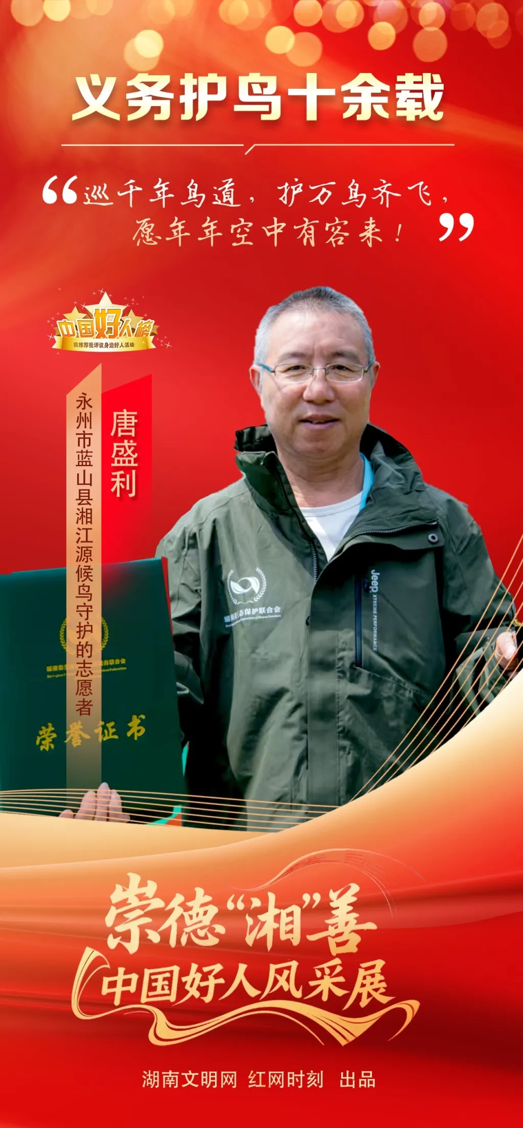 2023年,唐盛利被授予湖南省护鸟营十周年“突出贡献奖”,近日,他又荣登“中国好人榜”,成为敬业奉献的全国典范。谈及荣誉,他动情表示:“这份沉甸甸的荣誉,是对我十余年坚守爱鸟护鸟工作初心的最高褒奖。”