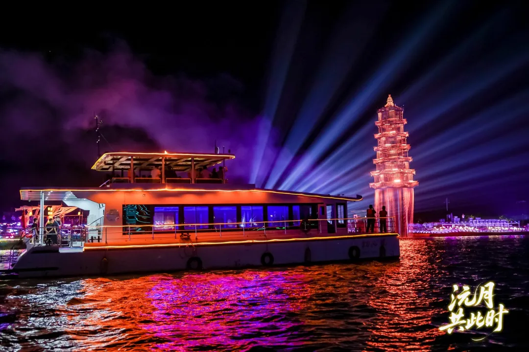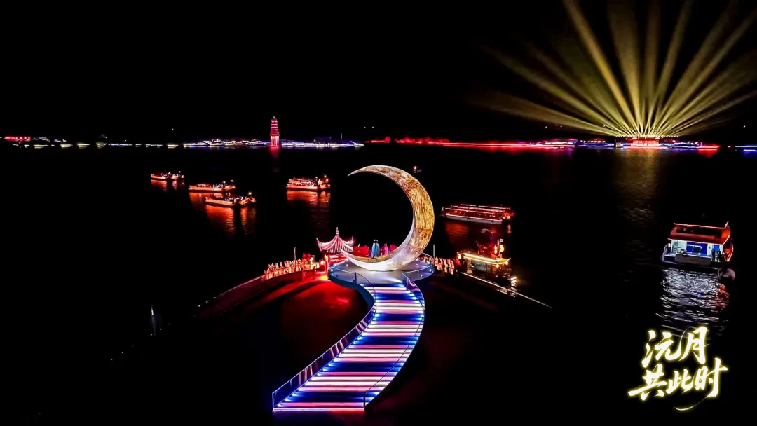 这场别具一格的夜游,以潇湘八景中的“洞庭秋月”为灵感源泉,以范蠡西施归隐洞庭湖的千年爱恋为叙事主线,巧妙地将沅江的“湖、渔、桥、塔、船”等特色元素编织成一幅流动的绝美画卷,在浩江湖的水天之间,徐徐铺展。该演出将作为常态化项目,丰富沅江文旅夜游体验。