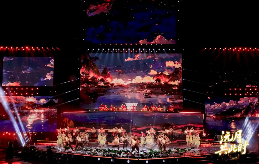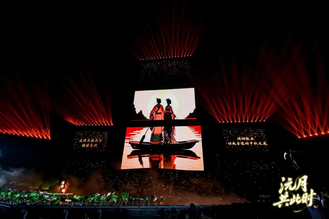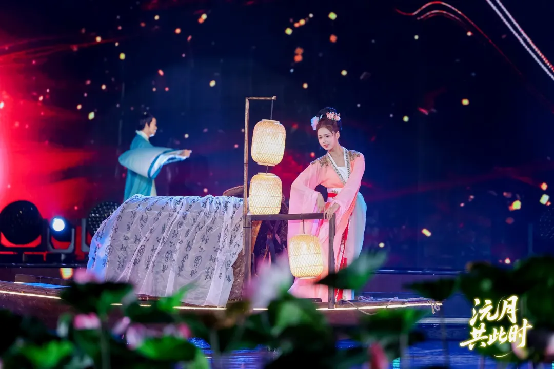 夜色来临,远方的游船缓缓而来。浩江湖上,渔歌唱晚、浣纱溪下、月光见证、点睛启航、沅水渔光、凌云智慧、横江威武、时光洪流、同心共誓、共证良缘等十幕场景逐一精彩上演。