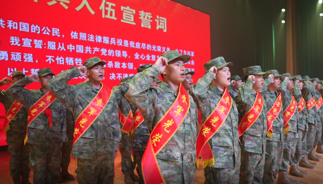 现场气氛热烈庄重,新兵们身着崭新戎装,精神抖擞,英姿勃发。会上,县委常委、县人武部部长熊巍宣读了新兵入伍命令;全体人员观看了邵阳籍革命英雄对新兵的寄语视频;新兵代表满怀激情作了表态发言;全体新兵进行庄严宣誓;退役老兵为新兵整理绶带并佩戴大红花;县领导为即将奔赴军营的大学生发放了入伍奖励金。