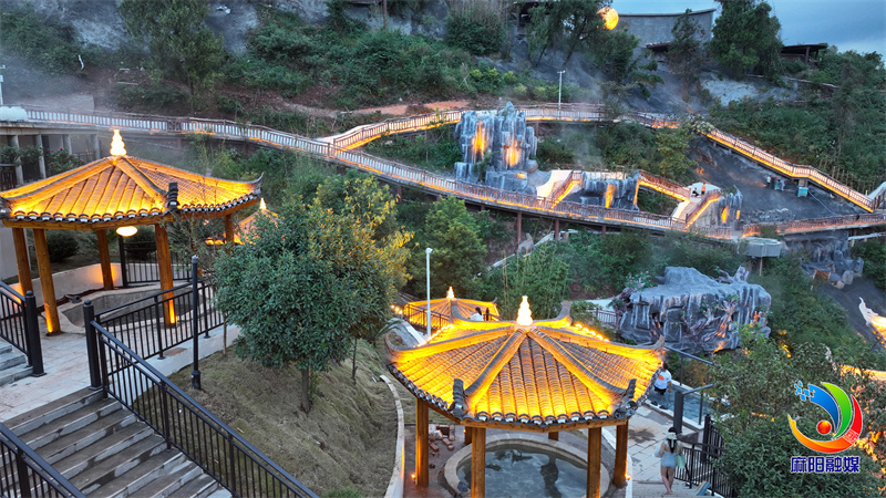 距离县城不足十公里的天沐云端温泉酒店紧邻隆家堡乡高速出口位置。温泉园区内绿植环绕,数十个露天汤池错落分布,氤氲热气随风飘散。“这边的温泉水质特别好,还有苗医养生药浴。泡完浑身舒畅,园区环境也很雅致,比待在城市里舒服多了。”游客小叶与同伴们或闭目休憩于花瓣池,或在石板浴上放松身心,亲子区里孩子们在温水池嬉戏,配套茶室中不时传来轻声交谈。