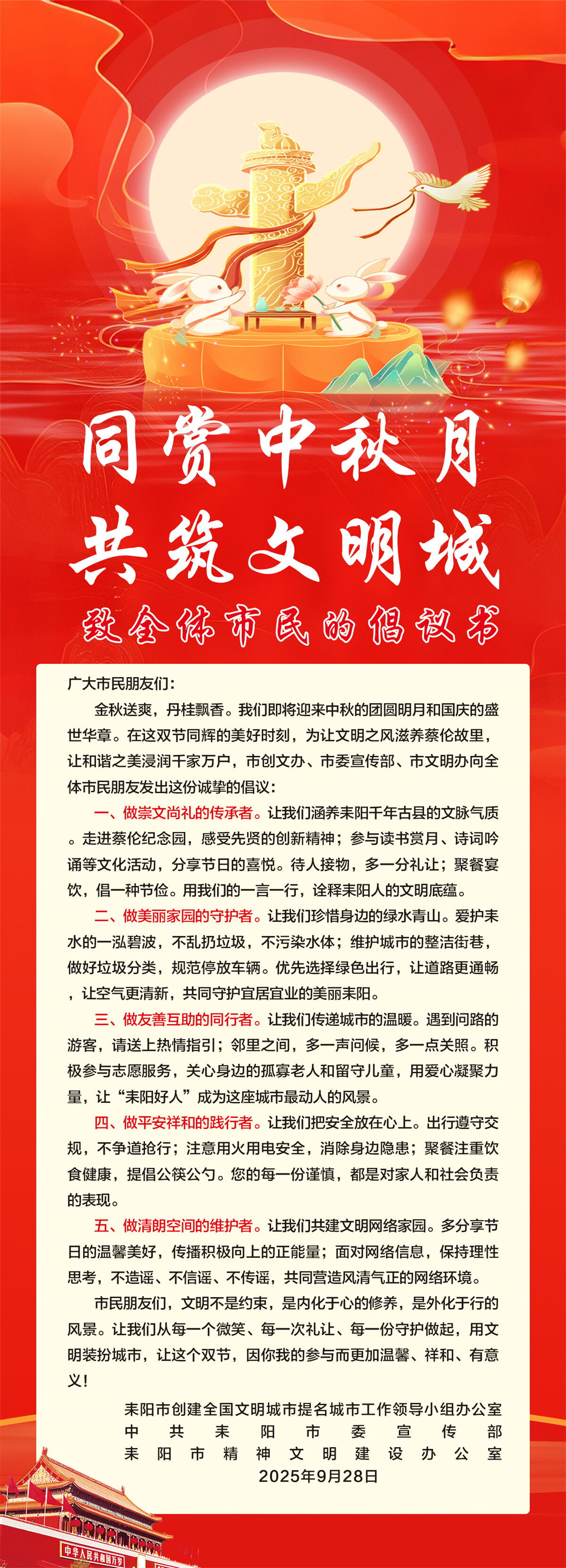 金秋送爽,丹桂飘香。我们即将迎来中秋的团圆明月和国庆的盛世华章。在这双节同辉的美好时刻,为让文明之风滋养蔡伦故里,让和谐之美浸润千家万户,市创文办、市委宣传部、市文明办向全体市民朋友发出这份诚挚的倡议: