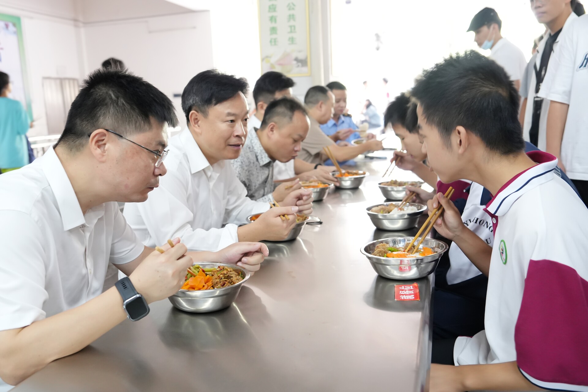 当天中午,吴韬一行在洞口一中北校区食堂与学生共同用餐,亲身体验餐品质量与口味,并与学生交流用餐感受。他指出,要持续优化供餐机制,加强营养管理,推动“校园餐”从“吃得饱”向“吃得好、吃得健康”转变,真正让学生满意、家长放心。